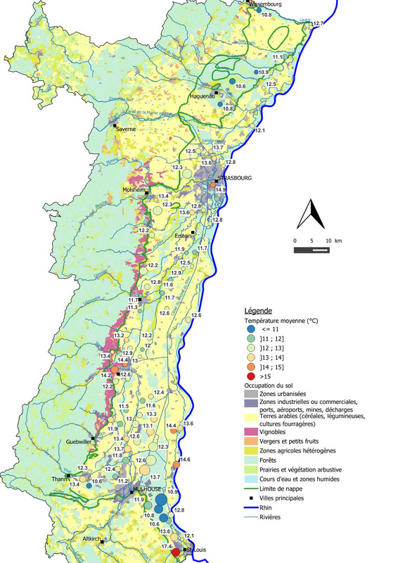 La moyenne des températures de la nappe rhénane calculée sur les 36 points de référence ayant une chronique complète et répondant à l’ensemble des critères sur la période est de 12.44°C. La moyenne des températures de la nappe du Pliocène de Haguenau (4 points de mesures) est de 10.76°C.